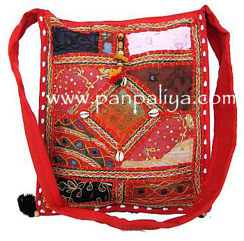 Traditional Mirror Work And embroidery are only on the front of the bag. The back, side and inner lining are plain Red cotton, closes with a Zip on the top.