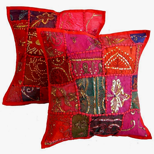 Magnificent and authentic pair of Red antique style patchwork pillow cushion covers from India! These enchanting pillow covers are covered with Moti bead work, sequins, gold thread work and more! These are the hallmarks of Jaipur Rajasthani craft work. Available in set of 2 and set of 5