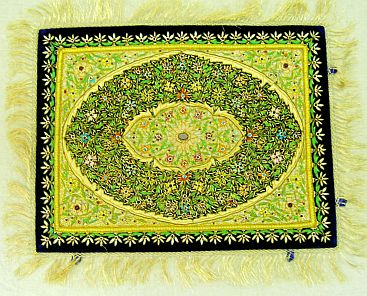 WONDERFUL INDIAN GOLDEN SILVER METALLIC THREADS ZARDOSI HAND EMBROIDERED JEWEL WALL HANGING CARPET WITH SEMI PRECIOUS STONE ONYX CORAL AND LAPIS