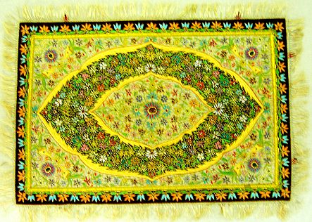 INDIAN GOLDEN SILVER METALLIC THREADS ZARDOSI HAND EMBROIDERED JEWEL WALL HANGING CARPET WITH SEMI PRECIOUS STONE